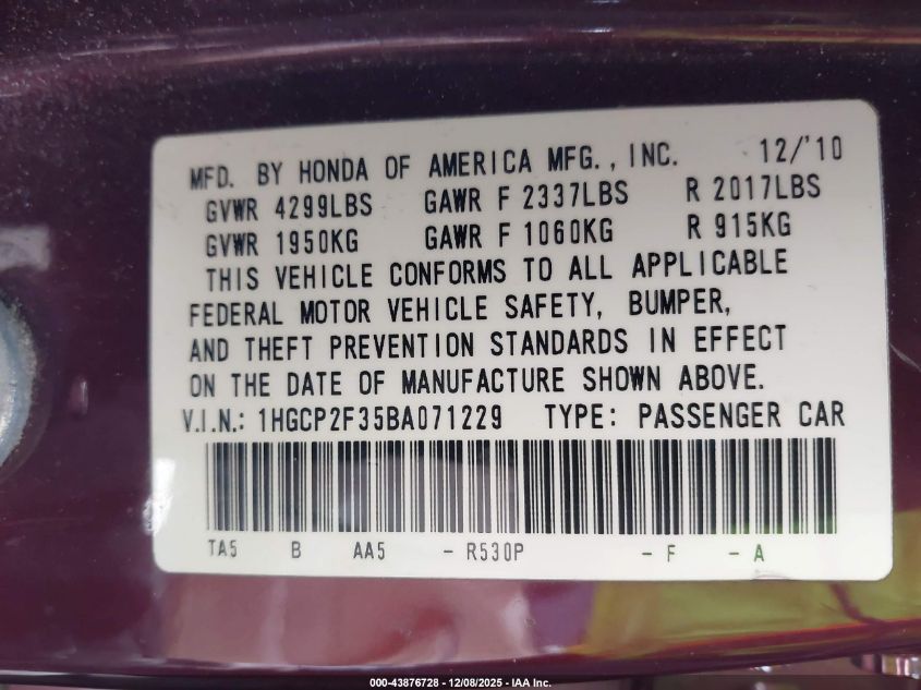 2011 HONDA ACCORD - 1HGCP2F35BA071229, колір - Бордовий, 2.4, Бензин, Передній привід із США