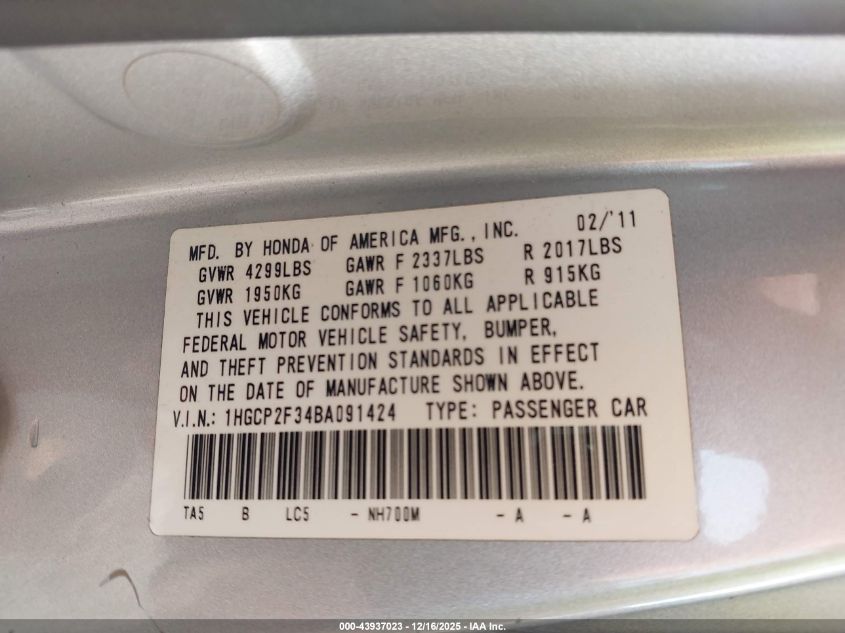 2011 HONDA ACCORD EX