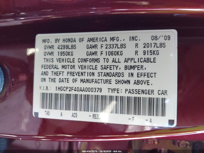 2010 HONDA ACCORD - 1HGCP2F40AA000379, колір - Червоний, 2.4, Бензин, Передній привід із США
