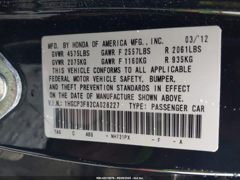 2012 HONDA ACCORD - 1HGCP3F82CA028227, колір - Чорний, 3.5, Бензин, Передній привід із США