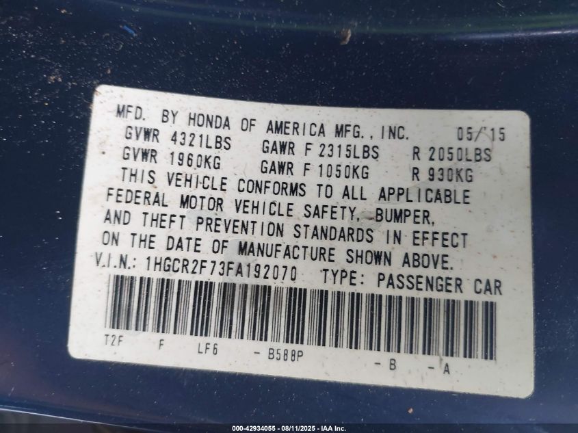 2015 HONDA ACCORD - 1HGCR2F73FA192070, колір - Синій, 2.4, Бензин, Передній привід із США