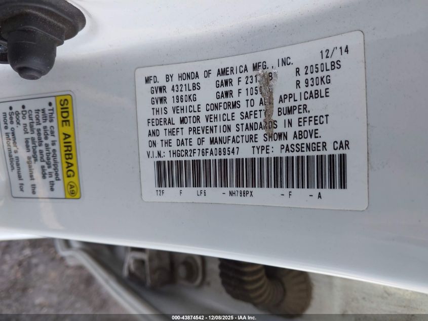 2015 HONDA ACCORD - 1HGCR2F76FA089547, колір - Білий, 2.4, Бензин, Передній привід із США