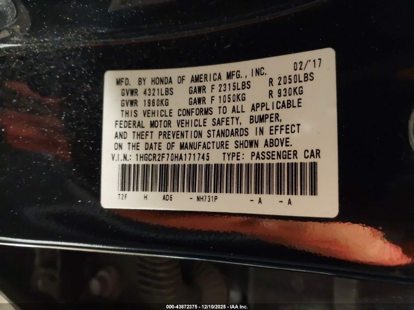 2017 HONDA ACCORD - 1HGCR2F70HA171745, колір - Чорний, 2.4, Бензин, Передній привід із США