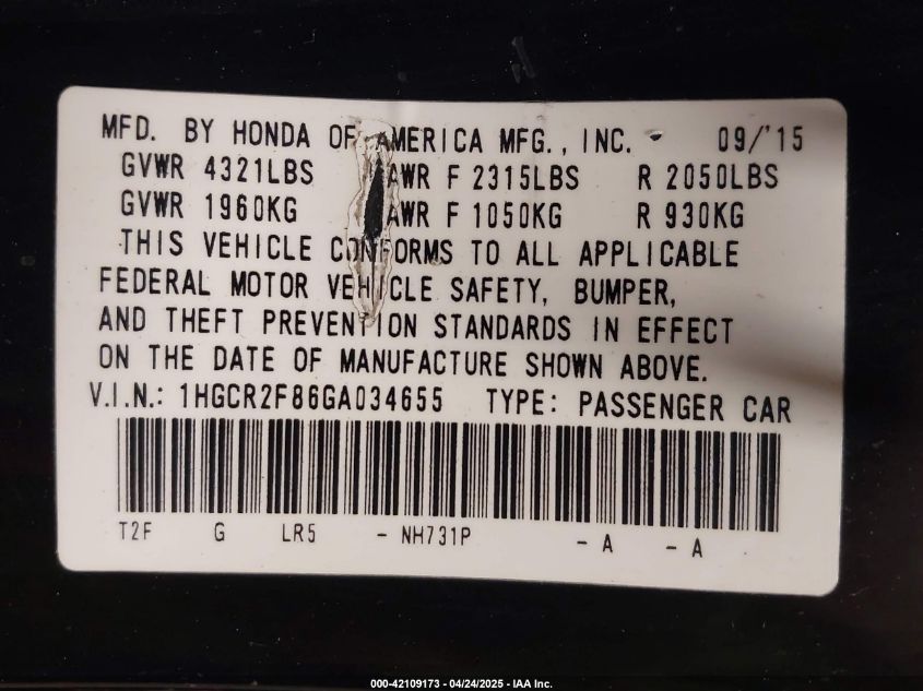 2016 HONDA ACCORD - 1HGCR2F86GA034655, колір - Чорний, 2.4, Бензин, Передній привід із США