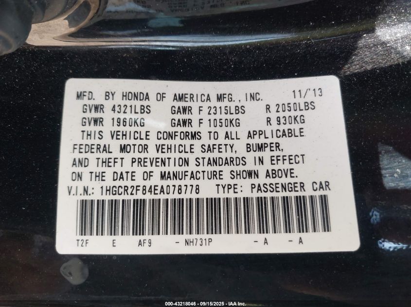 Колір ЧорнийЦиліндри 4Привід Передній привідVIN 1HGCR2F84EA078778Стан СтаціонарноУшкодження Вандалізм