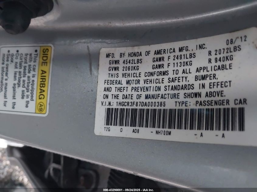 Колір СрібнийЦиліндри 6Привід Передній привідVIN 1HGCR3F87DA000385Стан СтаціонарноУшкодження Вандалізм