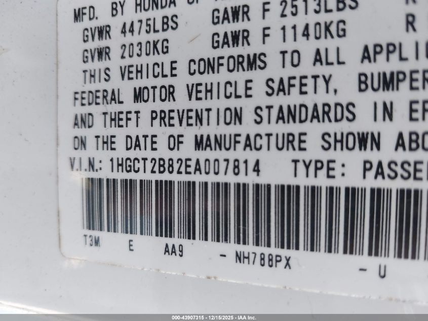 Колір БілийЦиліндри 6Привід Передній привідVIN 1HGCT2B82EA007814Стан Заводиться та їде (перевірено)Ушкодження Ліва сторона