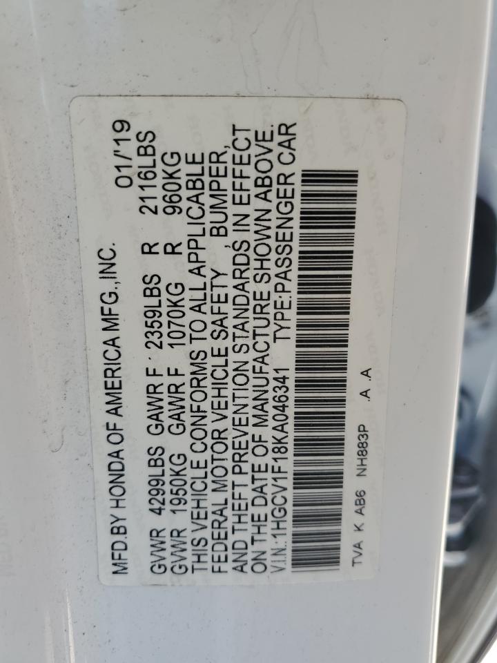 2019 HONDA ACCORD - 1HGCV1F18KA046341, колір - Білий, 1.5, Бензин, із США
