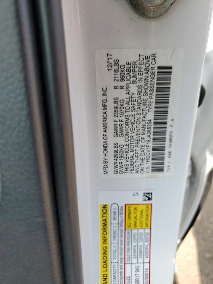2018 HONDA ACCORD - 1HGCV1F18JA068354, колір - Білий, 1.5, Бензин, із США