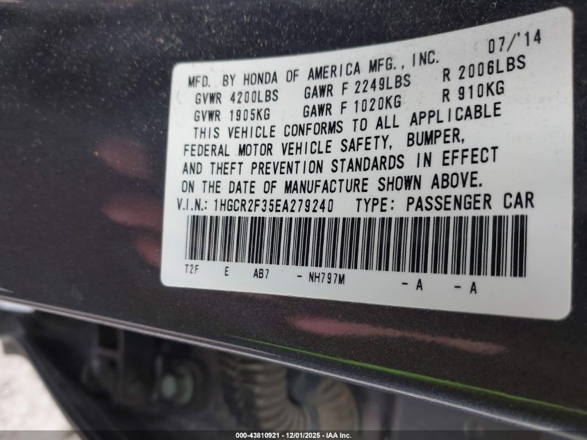 2014 HONDA ACCORD - 1HGCR2F35EA279240, колір - Сірий, 2.4, Бензин, Передній привід із США