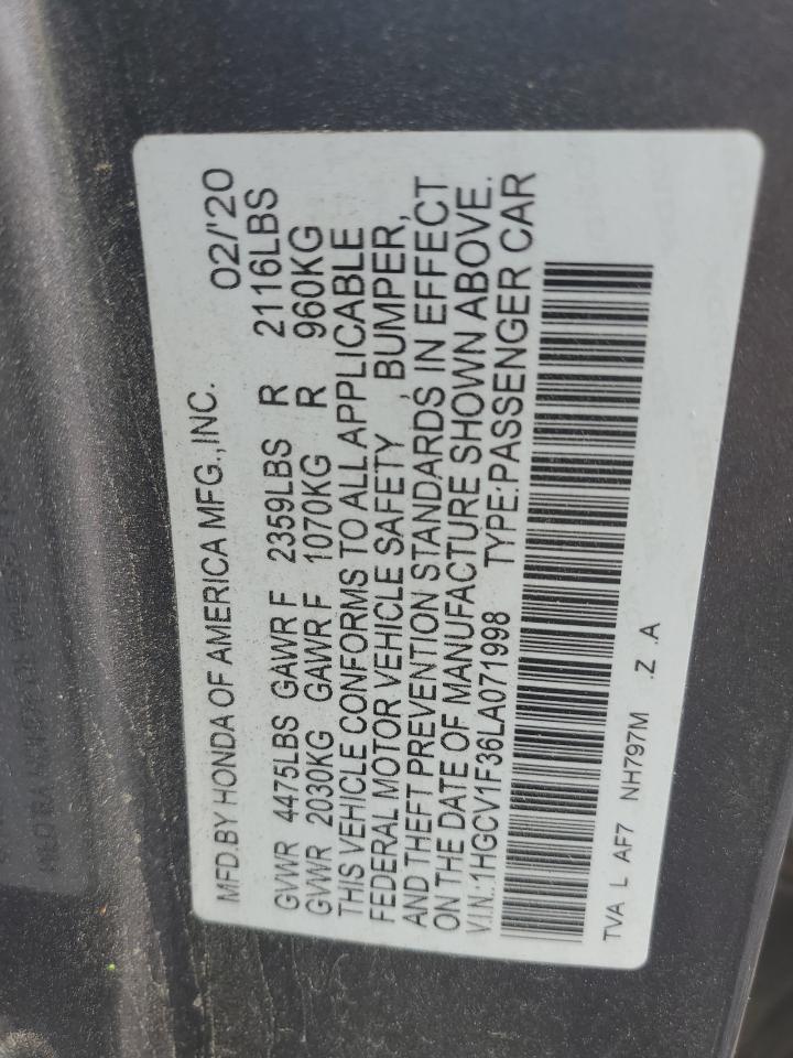 2020 HONDA ACCORD - 1HGCV1F36LA071998, колір - Сірий, 1.5, Бензин, із США