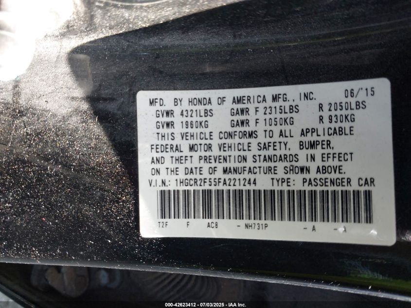 2015 HONDA ACCORD - 1HGCR2F55FA221244, колір - Чорний, 2.4, Бензин, Передній привід із США
