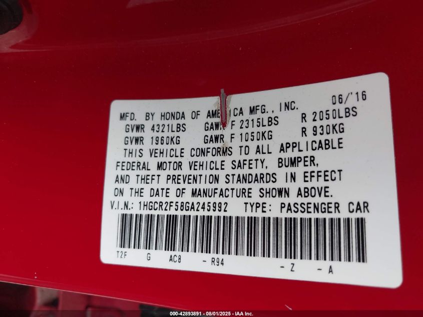 2016 HONDA ACCORD - 1HGCR2F58GA245992, колір - Червоний, 2.4, Бензин, Передній привід із США