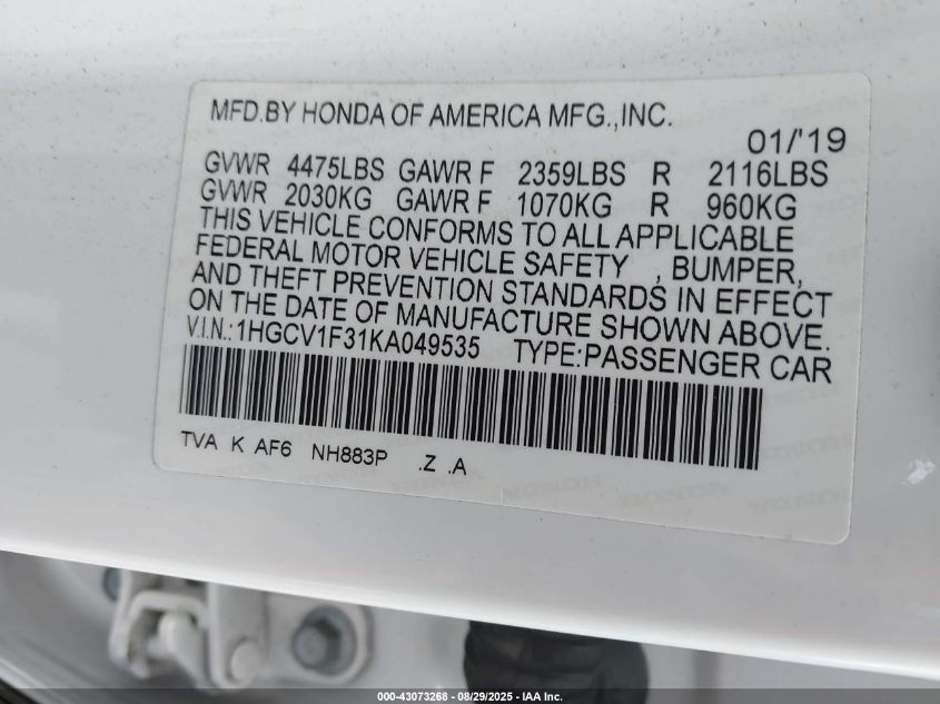 2019 HONDA ACCORD - 1HGCV1F31KA049535, колір - Білий, 1.5, Бензин, Передній привід із США