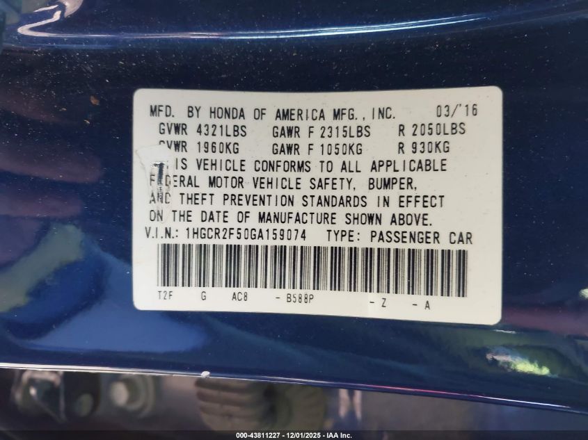 2016 HONDA ACCORD - 1HGCR2F50GA159074, колір - Синій, 2.4, Бензин, Передній привід із США