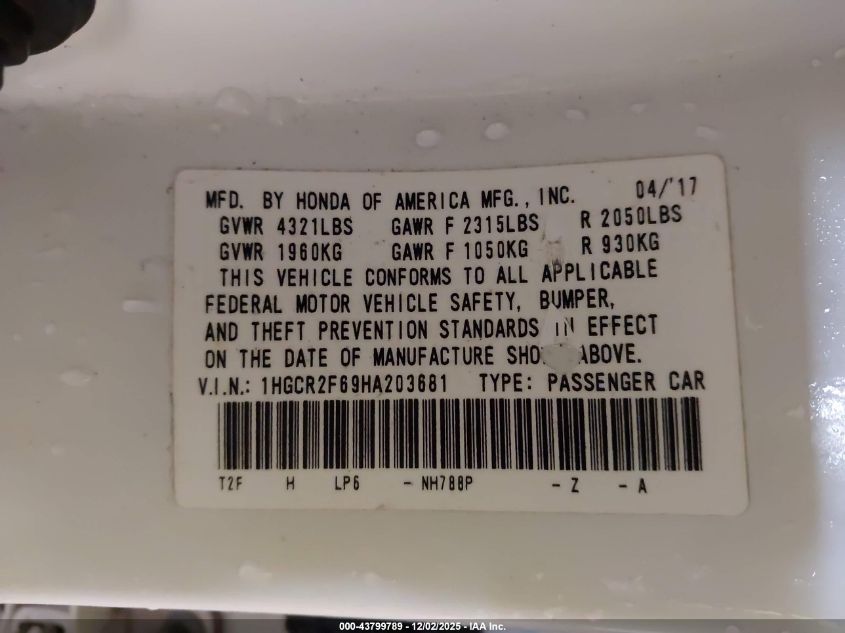2017 HONDA ACCORD - 1HGCR2F69HA203681, колір - Білий, 2.4, Бензин, Передній привід із США
