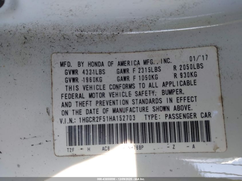 2017 HONDA ACCORD - 1HGCR2F51HA152703, колір - Білий, 2.4, Бензин, Передній привід із США