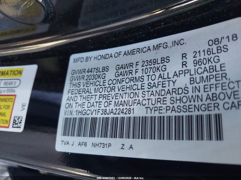 Колір ЧорнийЦиліндри 4Привід Передній привідVIN 1HGCV1F38JA224281Стан СтаціонарноУшкодження Передня і задня