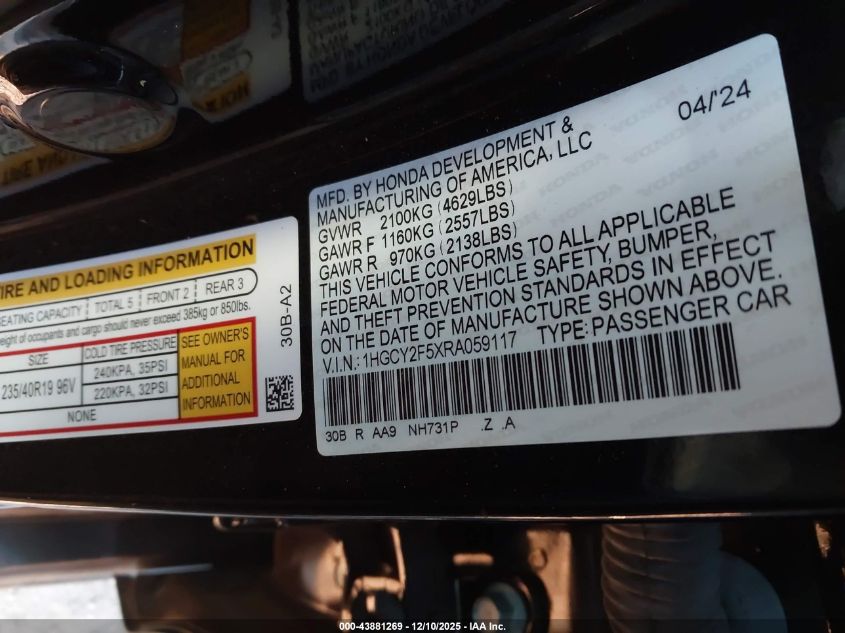 2024 HONDA ACCORD - 1HGCY2F5XRA059117, колір - Чорний, 2.0, Гібрид, Передній привід із США