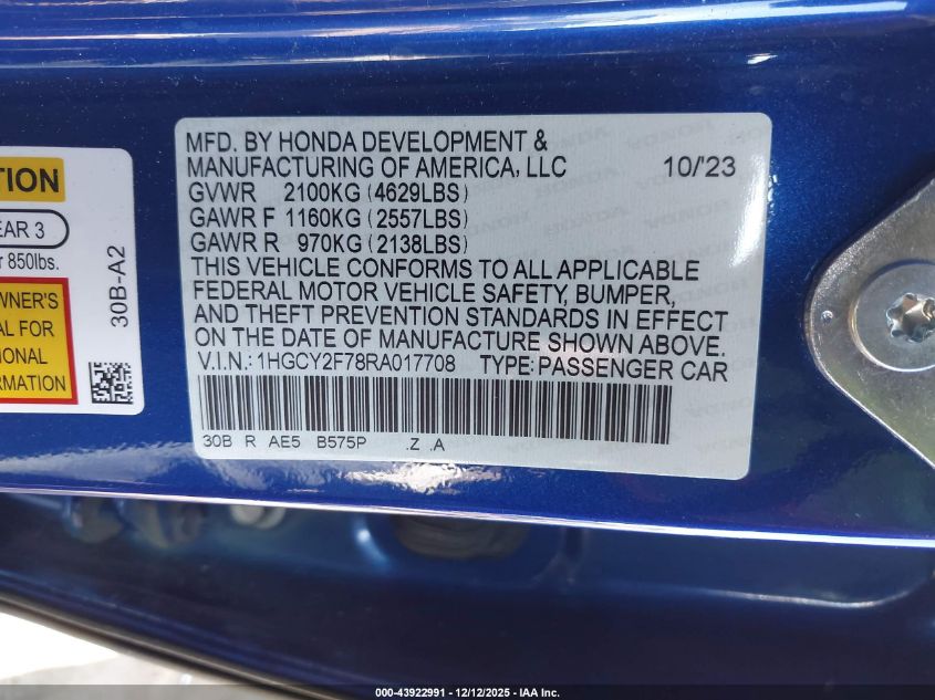 2024 HONDA ACCORD - 1HGCY2F78RA017708, колір - Синій, 2.0, Гібрид, Передній привід із США