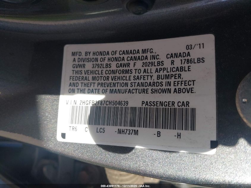 2012 HONDA CIVIC - 2HGFB2F87CH504639, колір - Сірий, 1.8, Бензин, Передній привід із США