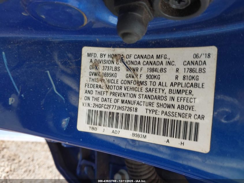 2018 HONDA CIVIC - 2HGFC2F77JH572618, колір - Синій, 2.0, Бензин, Передній привід із США