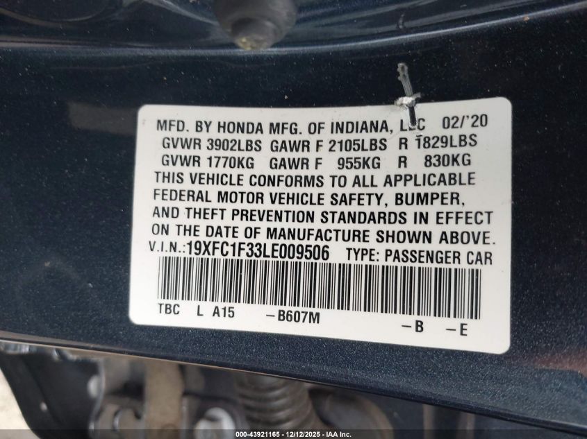 2020 HONDA CIVIC - 19XFC1F33LE009506, колір - Синій, 1.5, Бензин, Передній привід із США