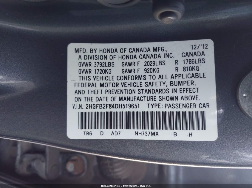 2013 HONDA CIVIC - 2HGFB2F84DH519651, колір - Сірий, 1.8, Бензин, Передній привід із США