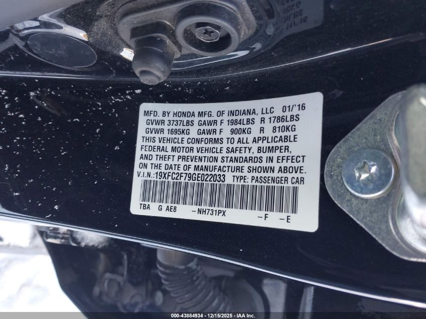 2016 HONDA CIVIC - 19XFC2F79GE022033, колір - Чорний, 2.0, Бензин, Передній привід із США