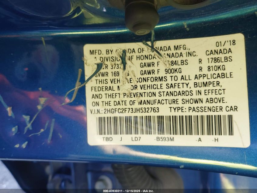 2018 HONDA CIVIC - 2HGFC2F73JH532763, колір - Синій, 2.0, Бензин, Передній привід із США