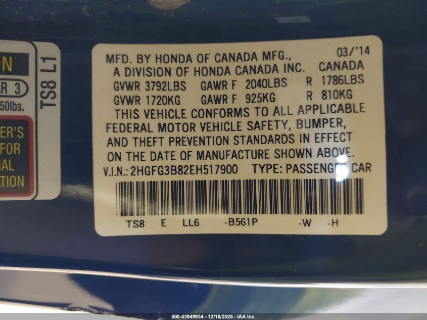 Колір СинійЦиліндри 4Привід Передній привідVIN 2HGFG3B82EH517900Стан НевідомоУшкодження Невідомо