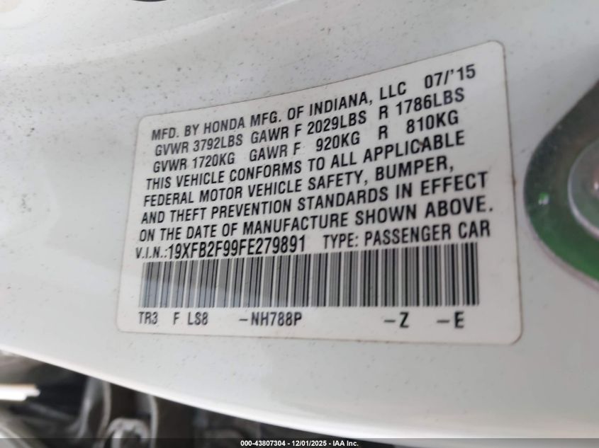 2015 HONDA CIVIC - 19XFB2F99FE279891, колір - Білий, 1.8, Бензин, Передній привід із США