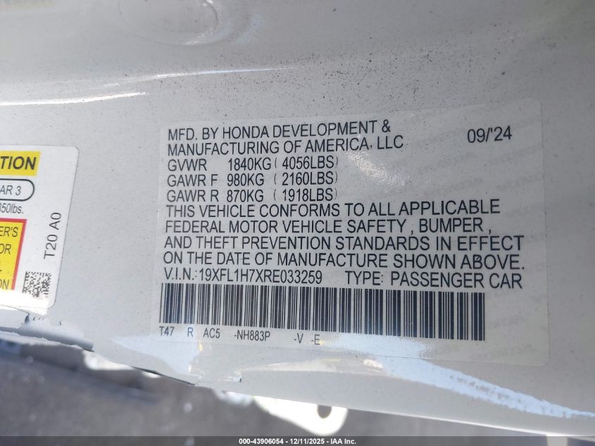 2024 HONDA CIVIC - 19XFL1H7XRE033259, колір - Білий, 1.5, Бензин, Передній привід із США