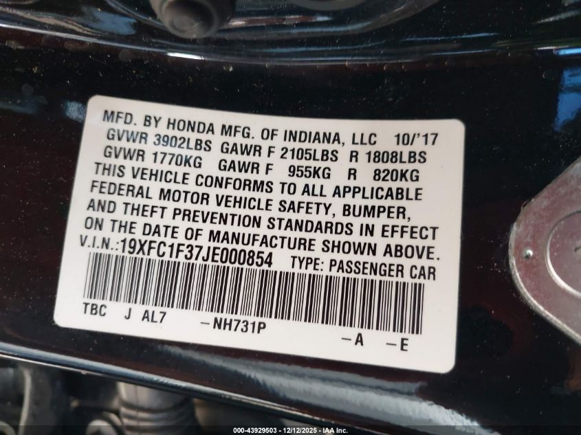 2018 HONDA CIVIC - 19XFC1F37JE000854, колір - Чорний, 1.5, Бензин, Передній привід із США