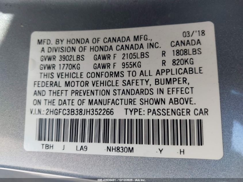 Колір СрібнийЦиліндри 4Привід Передній привідVIN 2HGFC3B38JH352266Стан Заводиться та їде (перевірено)Ушкодження Права сторона