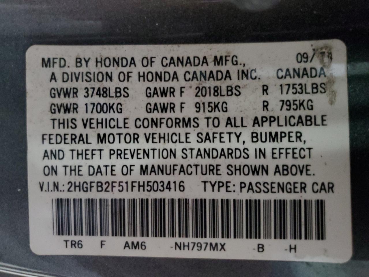 2015 HONDA CIVIC - 2HGFB2F51FH503416, колір - Сірий, 1.8, Бензин, із США