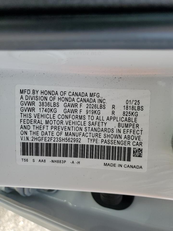 2025 HONDA CIVIC - 2HGFE2F23SH562992, колір - Білий, 2.0, Бензин, із США