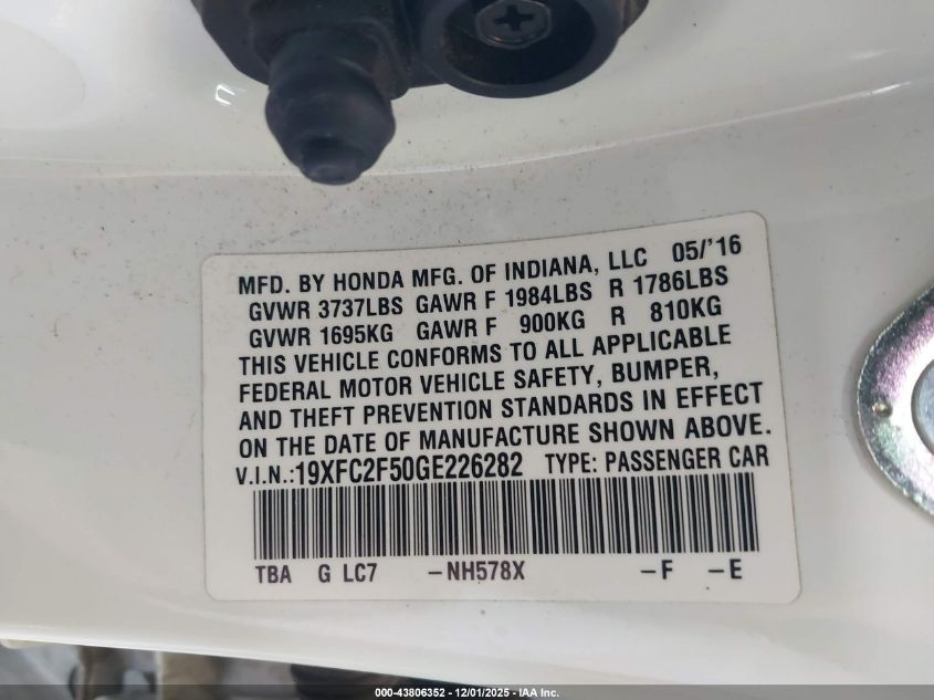 2016 HONDA CIVIC - 19XFC2F50GE226282, колір - Білий, 2.0, Бензин, Передній привід із США