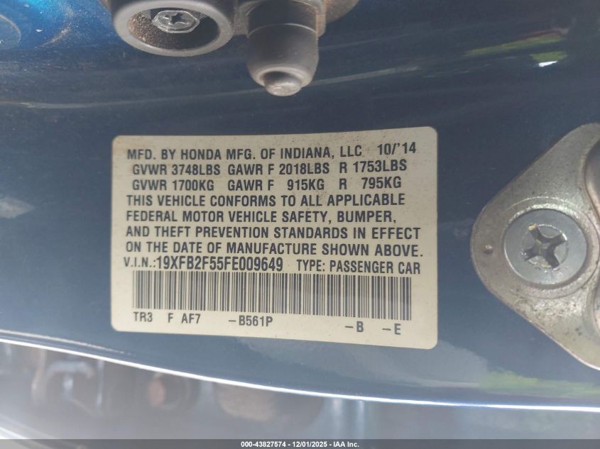 2015 HONDA CIVIC - 19XFB2F55FE009649, колір - Синій, 1.8, Бензин, Передній привід із США
