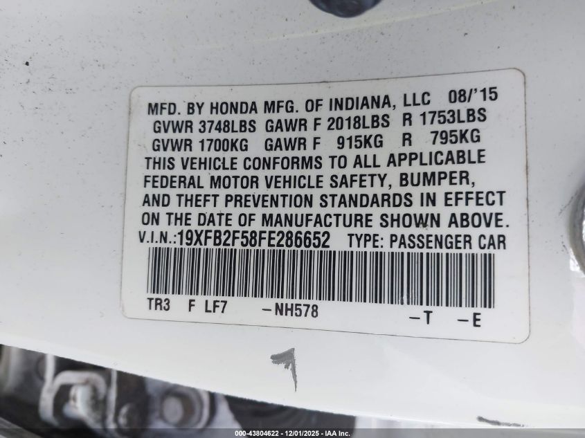 2015 HONDA CIVIC - 19XFB2F58FE286652, колір - Білий, 1.8, Бензин, Передній привід із США