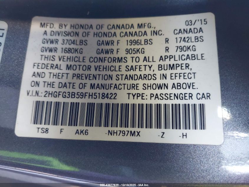 2015 HONDA CIVIC - 2HGFG3B59FH518422, колір - Сірий, 1.8, Бензин, Передній привід із США