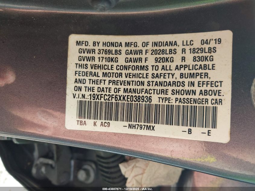 2019 HONDA CIVIC - 19XFC2F6XKE038936, колір - Сірий, 2.0, Бензин, Передній привід із США