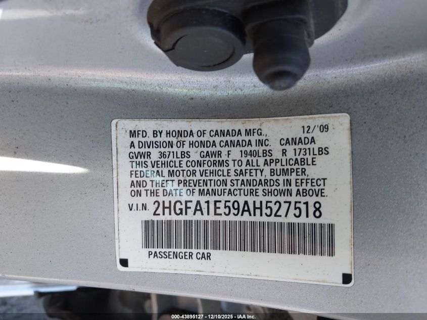 2010 HONDA CIVIC - 2HGFA1E59AH527518, колір - Срібний, 1.8, Бензин, Передній привід із США