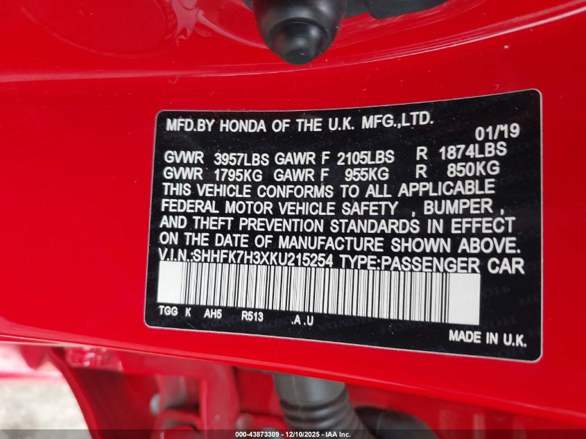 2019 HONDA CIVIC - SHHFK7H3XKU215254, колір - Червоний, 1.5, Бензин, Передній привід із США
