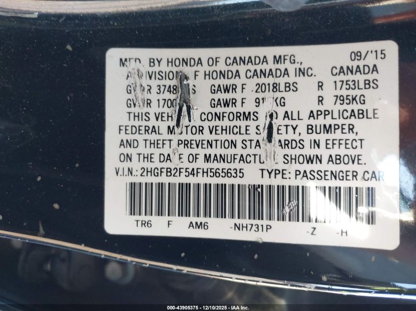 2015 HONDA CIVIC - 2HGFB2F54FH565635, колір - Чорний, 1.8, Бензин, Передній привід із США