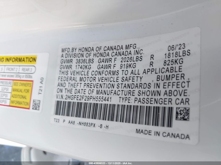 2023 HONDA CIVIC - 2HGFE2F29PH555441, колір - Білий, 2.0, Бензин, Передній привід із США