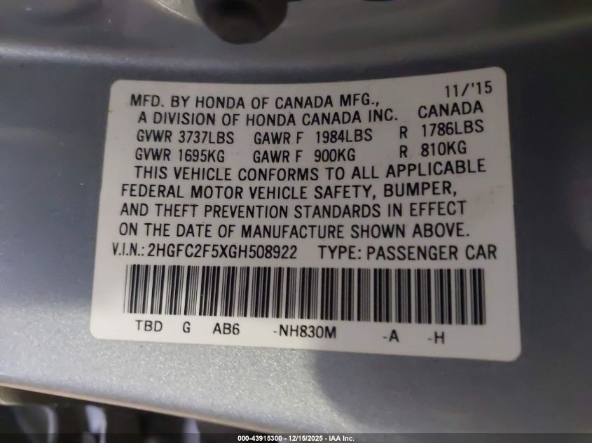Колір СірийЦиліндри 4Привід Передній привідVIN 2HGFC2F5XGH508922Стан СтаціонарноУшкодження Права сторона