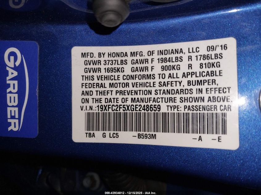 2016 HONDA CIVIC - 19XFC2F5XGE248659, колір - Синій, 2.0, Бензин, Передній привід із США