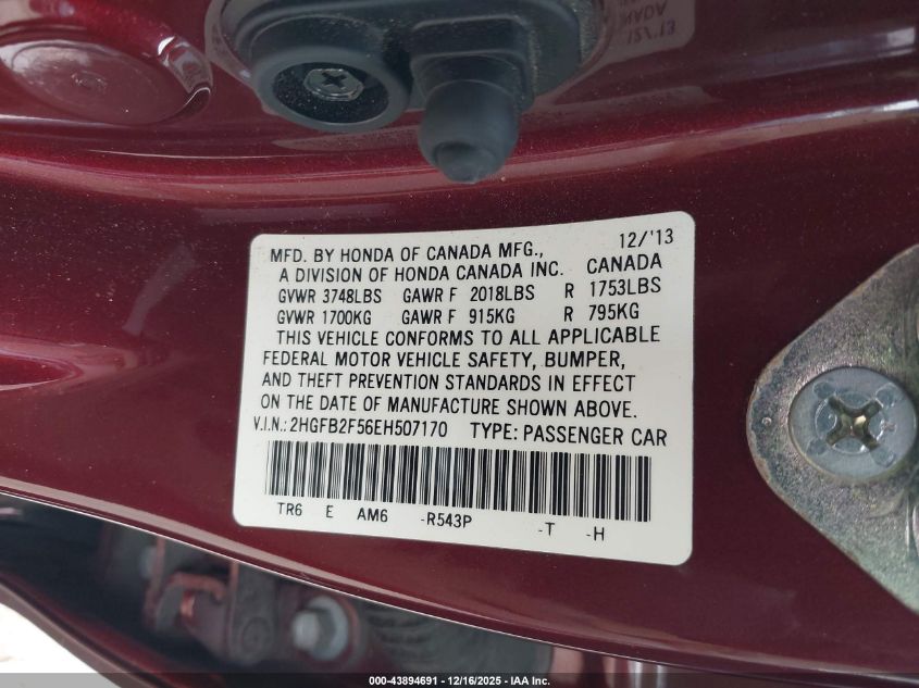 2014 HONDA CIVIC - 2HGFB2F56EH507170, колір - , 1.8, Бензин, Передній привід із США