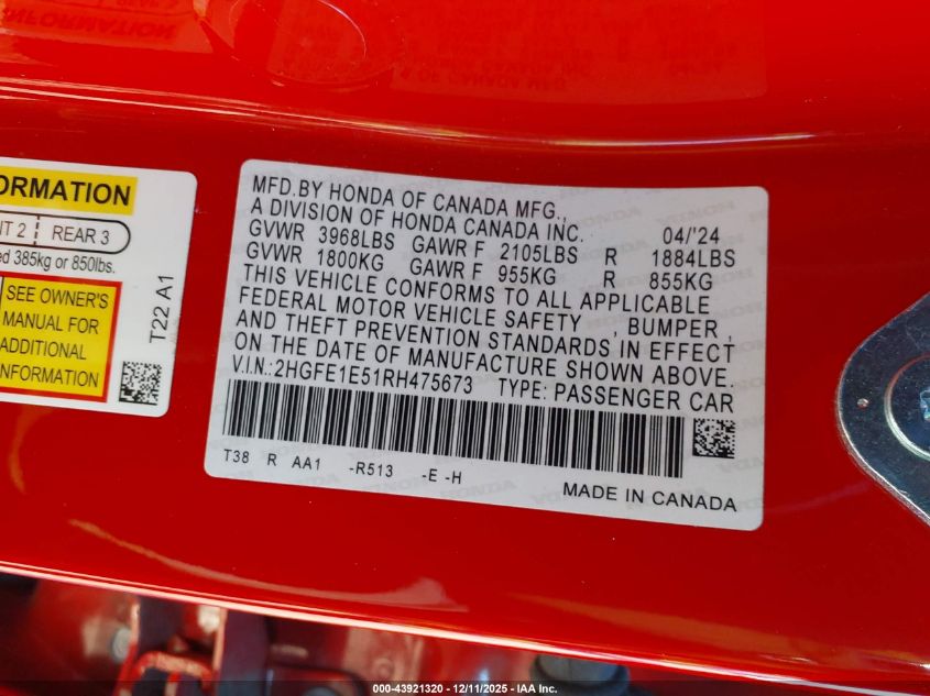2024 HONDA CIVIC - 2HGFE1E51RH475673, колір - Червоний, 1.5, Бензин, Передній привід із США